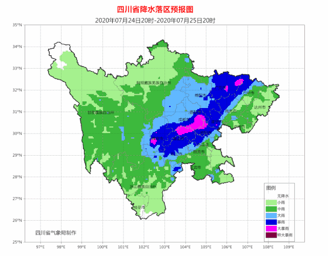 24日晚上到25日白天,四川还将会有一次较大范围的强降雨过程。预计 盆地各市阴天有雷雨或阵雨,雨量普遍为中雨,其中广元、绵阳、德阳、成都、雅安、眉山、乐山、遂宁8市和巴中、南充、资阳、内江4市西部有大到暴雨,局部大暴雨;川西高原和攀西地区阴天间多云有小到中雨。