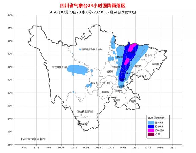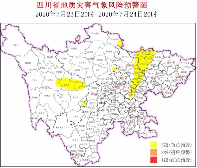 7月23日20时~7月24日20时,广元大部,德阳、绵阳、成都、甘孜4市(州)东部,南充、遂宁、资阳3市西部,阿坝州东部及南部局地发生地质灾害的风险较高。请上述地区加强地质灾害防范。