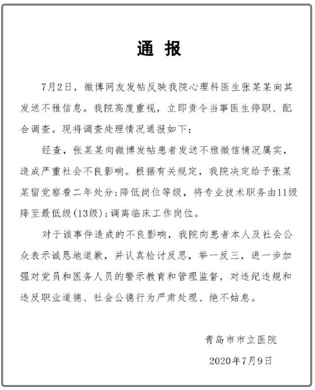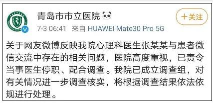 关于网友微博反映我院心理科医生张某某与患者微信交流中存在的相关问题,医院高度重视,已责令当事医生停职、配合调查。