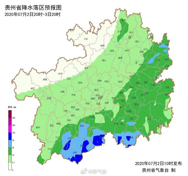 据贵州省气象台预报,7月2日夜间到3日白天,贵州省的北部地区阴间多云有分散阵雨,其余地区阴间多云有阵雨或雷雨,东部和南部地区有中到大雨,南部边缘地区个别乡镇有暴雨或大暴雨。