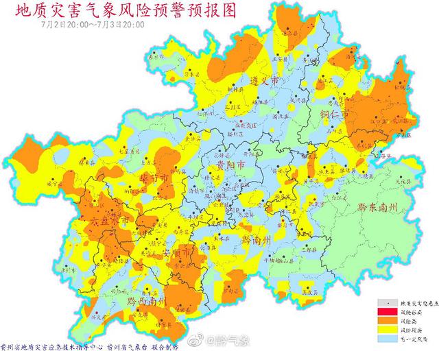 由于贵州省近期连续强降雨天气过程,贵州省自然资源厅、省气象局继续发布地质灾害气象风险预报,其中20个县(市、区)橙色预警,42个黄色预警。