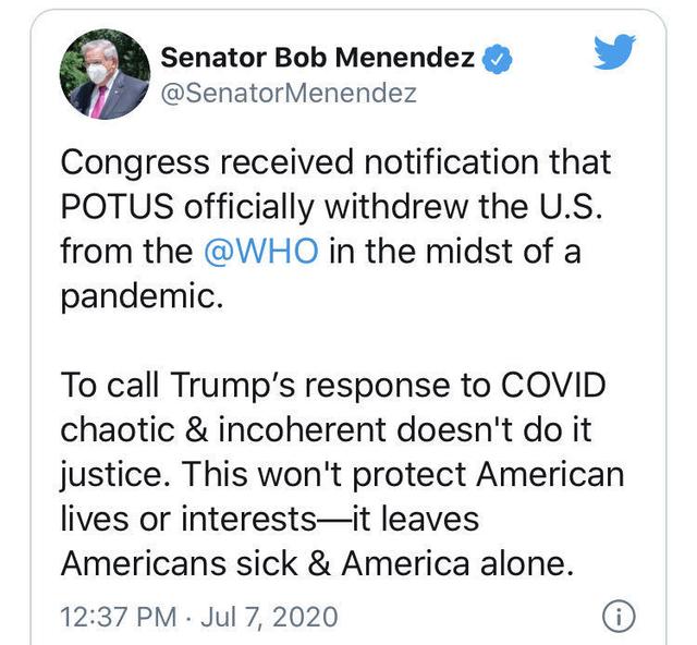 “国会收到通知,美国总统在全球疫情大流行期间,正式将美国从世卫组织中撤出。”美国国会参议院外交关系委员会成员罗伯特·梅嫩德斯7月7日则称,特朗普在新冠疫情应对中表现出“混乱和前后不一”,退出世卫组织的举动“不会保护美国人民的生命或利益,而是使美国人生病,使美国孤立无援”。