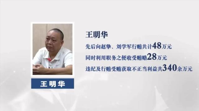 据查,王明华先后向赵挚、刘学军行贿共计48万元,同时利用职务之便收受贿赂28万元,违纪及行贿受贿获取不正当利益共340余万元。2019年6月20日,王明华受到开除党籍处分;2020年4月8日,因犯受贿罪、行贿罪、诈骗罪,数罪并罚,被仁和区人民法院判处有期徒刑五年六个月,并处罚金15万元。相关涉案人员也先后受到了党纪法律的惩处。