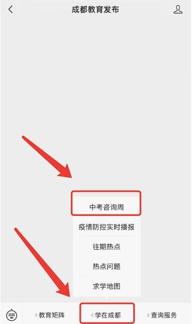 微信关注成都招生考试(微信号:cdzk789),菜单栏点击“中考咨询”-“中考咨询周”进入。
