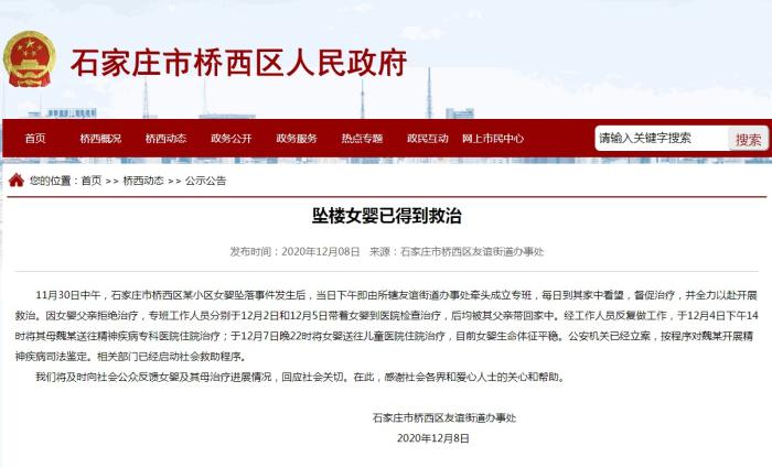 ——11月30日中午,石家庄市桥西区某小区女婴坠落事件发生后,当日下午即由所辖友谊街道办事处牵头成立专班,每日到其家中看望,督促治疗,并全力以赴开展救治。