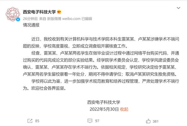 30日晚,@西安电子科技大学 发布情况通报回应该校两名学生涉嫌学术不端问题,通报称:经查,该校雷某某、卢某某两名学生在做毕业设计过程中通过网络平台购买代码,并通过购买的代码完成论文的部分实验结果。经学院学术委员会认定,学校学风建设委员会确认,雷某某、卢某某存在学术不端行为。依据相关规定,学校研究决定给予雷某某、卢某某两名学生留校察看一年处分,期间不得申请学位;取消卢某某研究生推免资格。此前,网络上曾有人曝光称西安电子科技大学两名学生在平台上找“枪手”代做毕业设计。