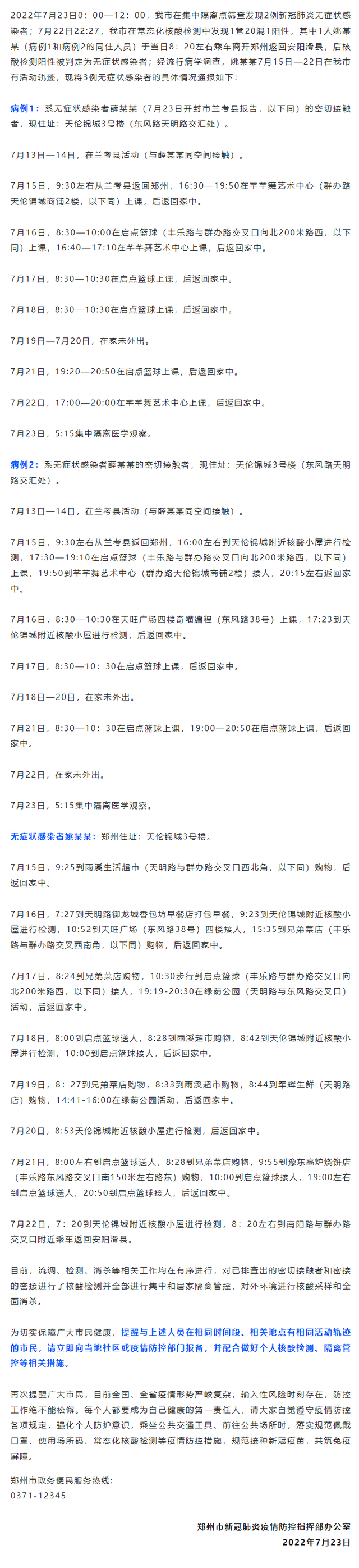 河南郑州市新冠肺炎疫情防控指挥部办公室23日通报,关于郑州新增2例新冠肺炎无症状感染者和安阳市1例无症状感染者在郑州活动轨迹的情况,具体内容如下: