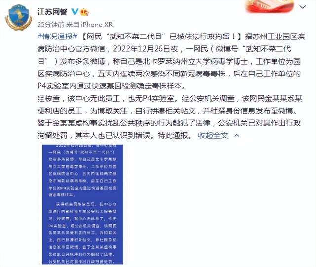 12月26日夜,网民“武知不菜二代目”发布多条微博,称自己是美国北卡罗莱纳州立大学病毒学博士,工作单位为苏州工业园区疾病防治中心,五天内连续两次感染不同新冠病毒毒株,后在工作单位的P4实验室内通过快速基因检测确定毒株样本。昨晚,苏州工业园区疾病防治中心发布通报,经核查,该中心无此员工,也无P4实验室。经当地警方调查,该网民金某某系某便利店员工,为博取关注,自行拼凑相关帖文,并杜撰身份信息发布至微博。鉴于金某某虚构事实扰乱公共秩序的行为触犯了法律,已对其作出行政拘留处罚。