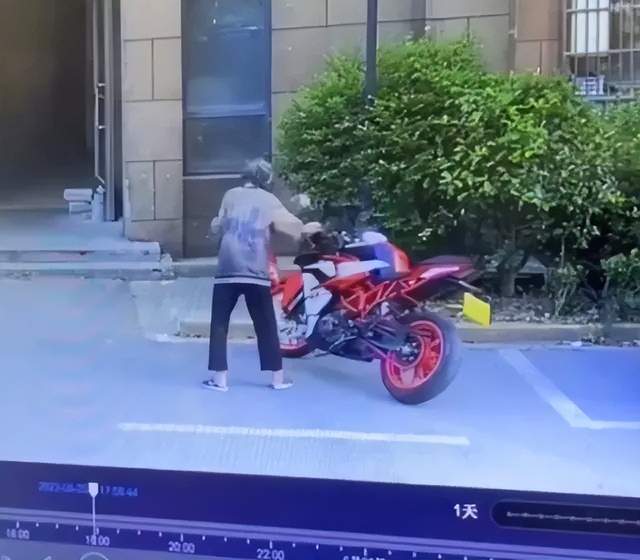 据悉,陈先生的摩托车型号为KTM-rc390,落地价格约6万元,一百多公斤重的摩托车,不用大力碰撞很难倒地。第二天,陈先生和物业一起调取了小区监控,惊讶地发现竟是一位路过的老人所为。