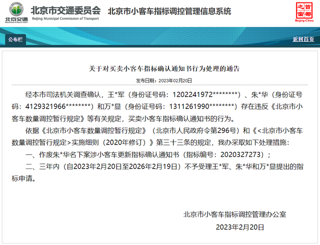 2月20日,北京市小客车指标调控管理办公室发布《关于对买卖小客车指标确认通知书行为处理的通告》,内容如下: