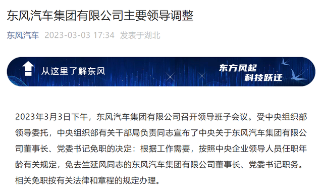 受中央组织部领导委托,中央组织部有关干部局负责同志宣布了中央关于东风汽车集团有限公司董事长、党委书记免职的决定:根据工作需要,按照中央企业领导人员任职年龄有关规定,免去竺延风同志的东风汽车集团有限公司董事长、党委书记职务。相关免职按有关法律和章程的规定办理。