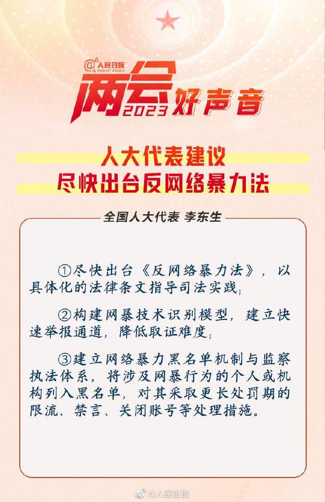“建议尽快出台《反网络暴力法》,构建网络暴力常态化治理机制。”在新一届全国人大即将召开之际,全国人大代表、TCL创始人、董事长李东生表示,恶性网暴事件屡禁不止,网络暴力治理工作依然任重而道远,出台《反网络暴力法》是治理网络暴力的良方。