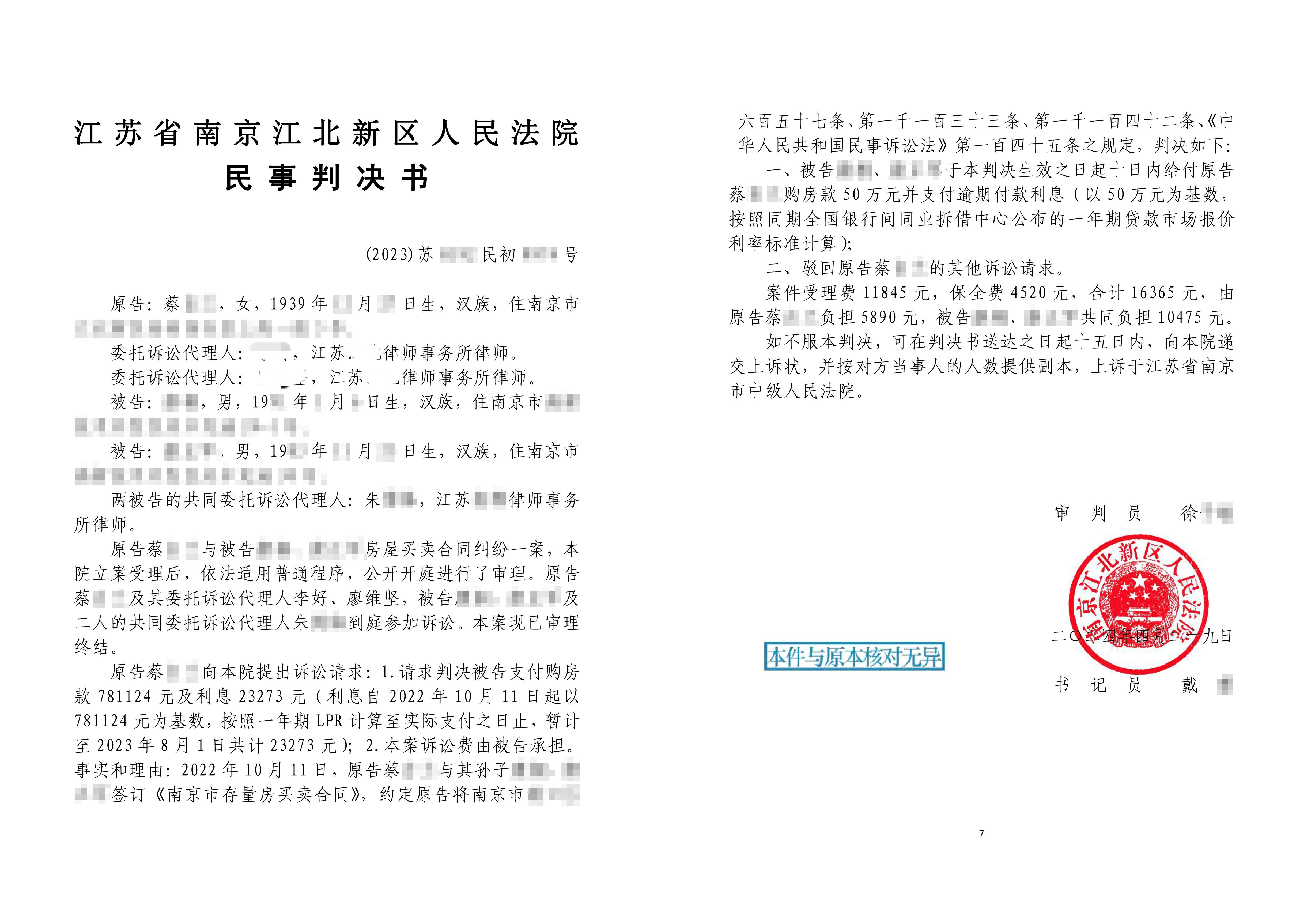 现代快报记者了解到,原来早在2022年10月11日,蔡奶奶与大孙子、小孙子共同签订了一份《南京市存量房买卖合同》。双方约定,蔡奶奶将名下这套84.17平方米的房子,以50万元的成交价,转移登记至大孙子和小孙子名下,二人各占一半份额。双方虽约定过户前全额付款,实际上,蔡奶奶并未要求两个孙子向她支付房款。
