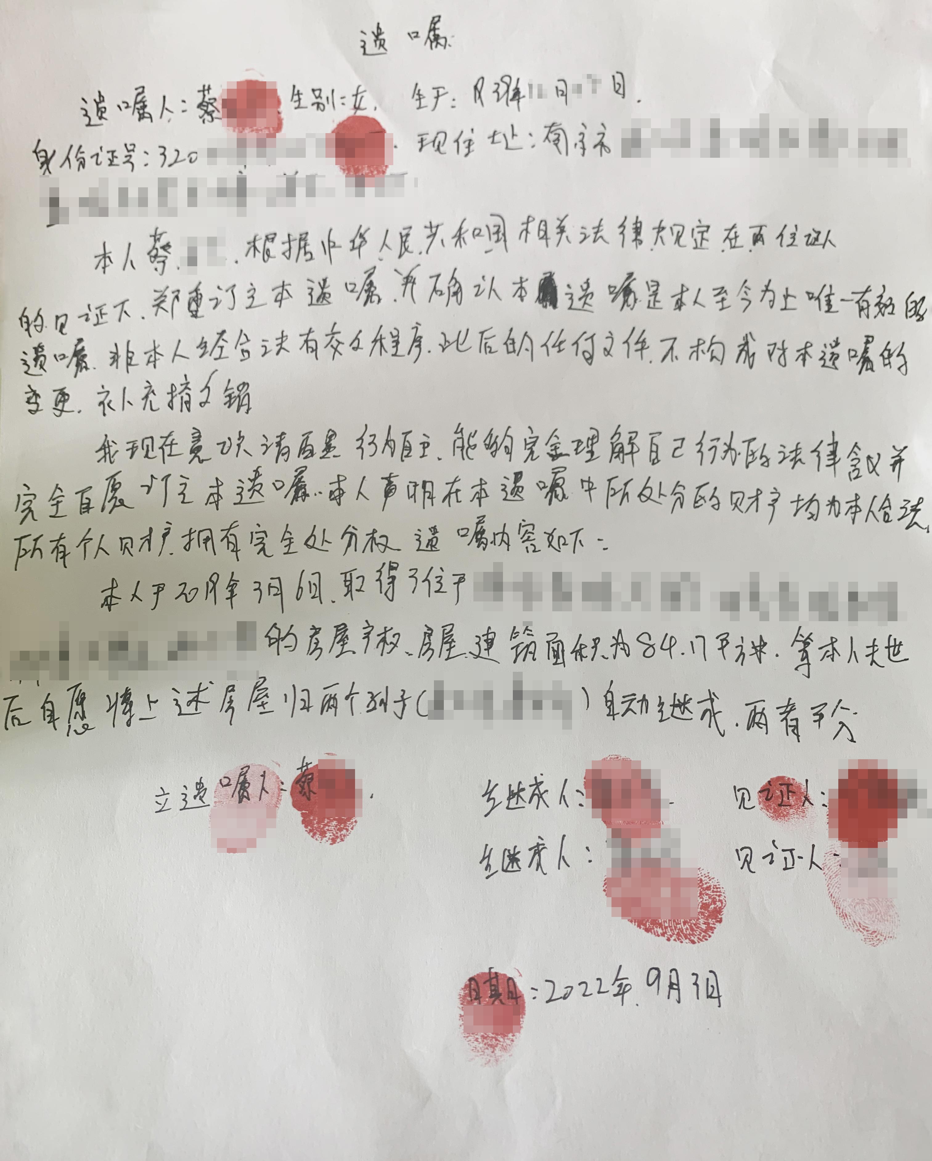 诉讼过程中,二人向法庭提交了蔡奶奶签名的遗嘱及视频各一份,遗嘱订立时间是2022年9月3日。在遗嘱中,蔡奶奶言明,等自己去世后,前述房产由大孙子和小孙子自动继承,两者平分。庭审现场,蔡奶奶质证认为,两个遗嘱见证人是其孙子的朋友,她都不认识,况且自己的本意是去世以后房产由二人继承,并不能推导出生前赠与的意思。