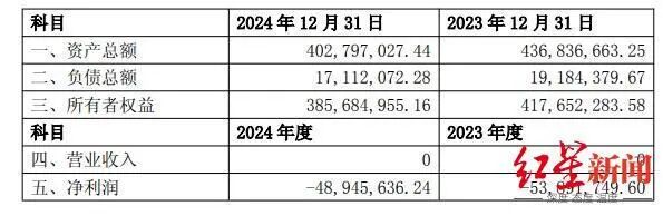 微成都注意到,匹克公司目前处于亏损状态。2023年、2024年,该公司的营收为0元,净利润分别为-5389万元、-4894.56万元。截至2024年末,其资产总额从2023年末的4.368亿元降至4.028亿元。