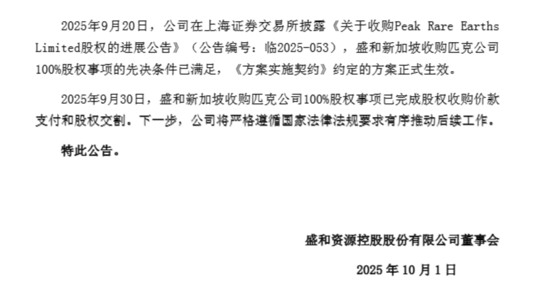 9月30日,盛和资源公告称:全资子公司盛和资源(新加坡)有限公司(以下简称“盛和新加坡”)收购匹克公司100%股权事项已完成股权收购价款支付和股权交割。下一步,公司将严格遵循国家法律法规要求有序推动后续工作。