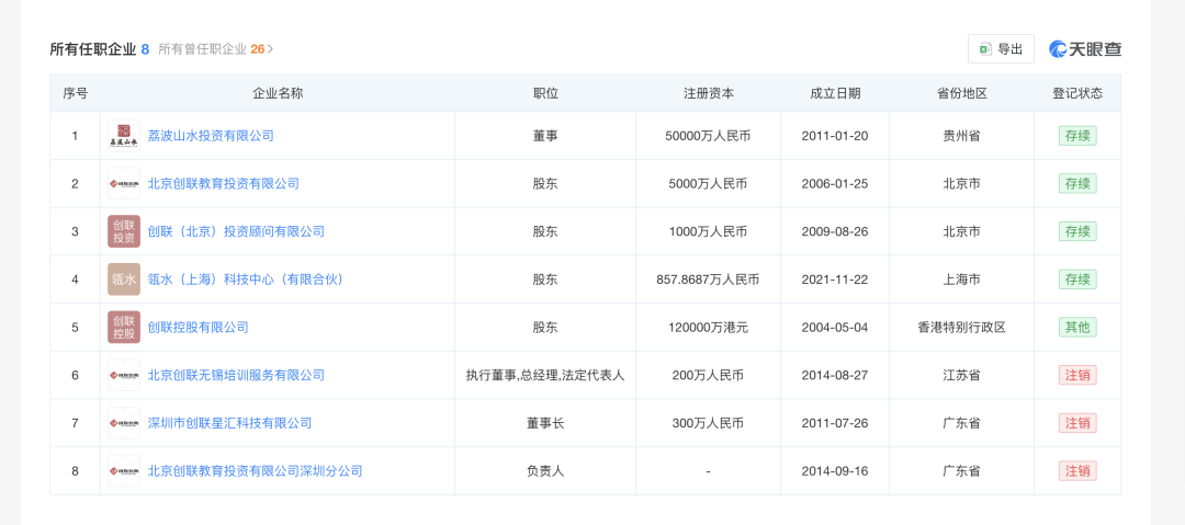 天眼查App显示,路行名下共关联8家企业,其中5家为存续状态,包括荔波山水投资有限公司、北京创联教育投资有限公司等,涉及教育投资、科技等领域,路行在上述公司担任董事或持有股份。