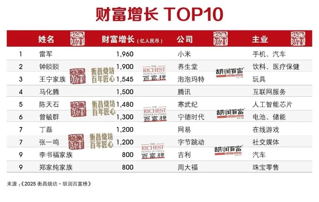1198位企业家财富比去年增长,小米的雷军成为“增长王”,财富比去年增长1960亿元,主要得益于小米汽车业务的爆发式增长和手机高端化突破带来的盈利跃升;其他增长较快的企业家还包括泡泡玛特38岁的王宁,凭借Labubu全球爆红,财富增长1545亿元;寒武纪40岁的陈天石则凭AI芯片落地加速,业绩增长迅速,8月底股价一度超越茅台,财富增长1480亿元。