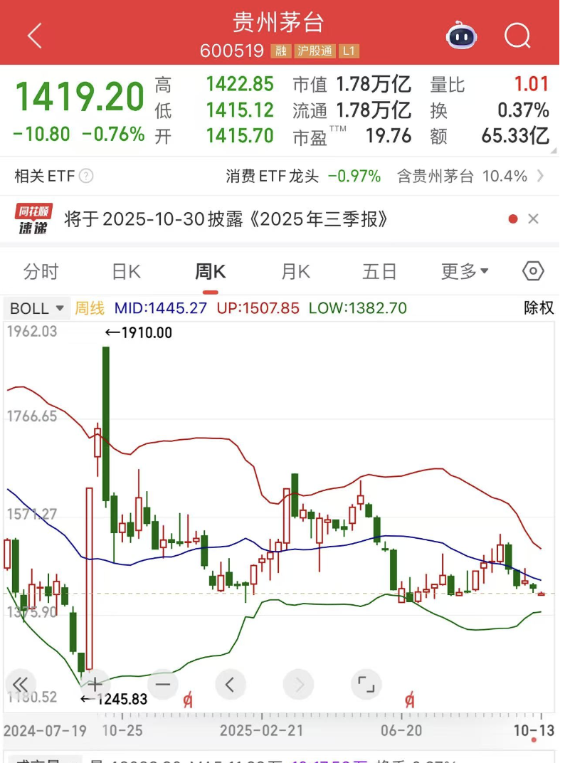 红星资本局注意到,今年以来,贵州茅台走势偏震荡,截至今日收盘,茅台股价相较于年内3月最高点1658点,已下跌超过10%。今日报1419.20元/股,跌0.76%,市值为1.78万亿元。8月12日,贵州茅台发布2025年半年报,报告期内,公司实现营业总收入910.94亿元,同比增长9.16%;实现净利润454.03亿元,同比增长8.89%。