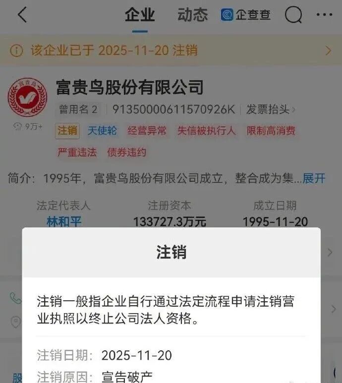 11月24日,有媒体报道,天眼查APP显示,富贵鸟股份有限公司登记状态由存续变更为注销,注销原因为宣告破产。
