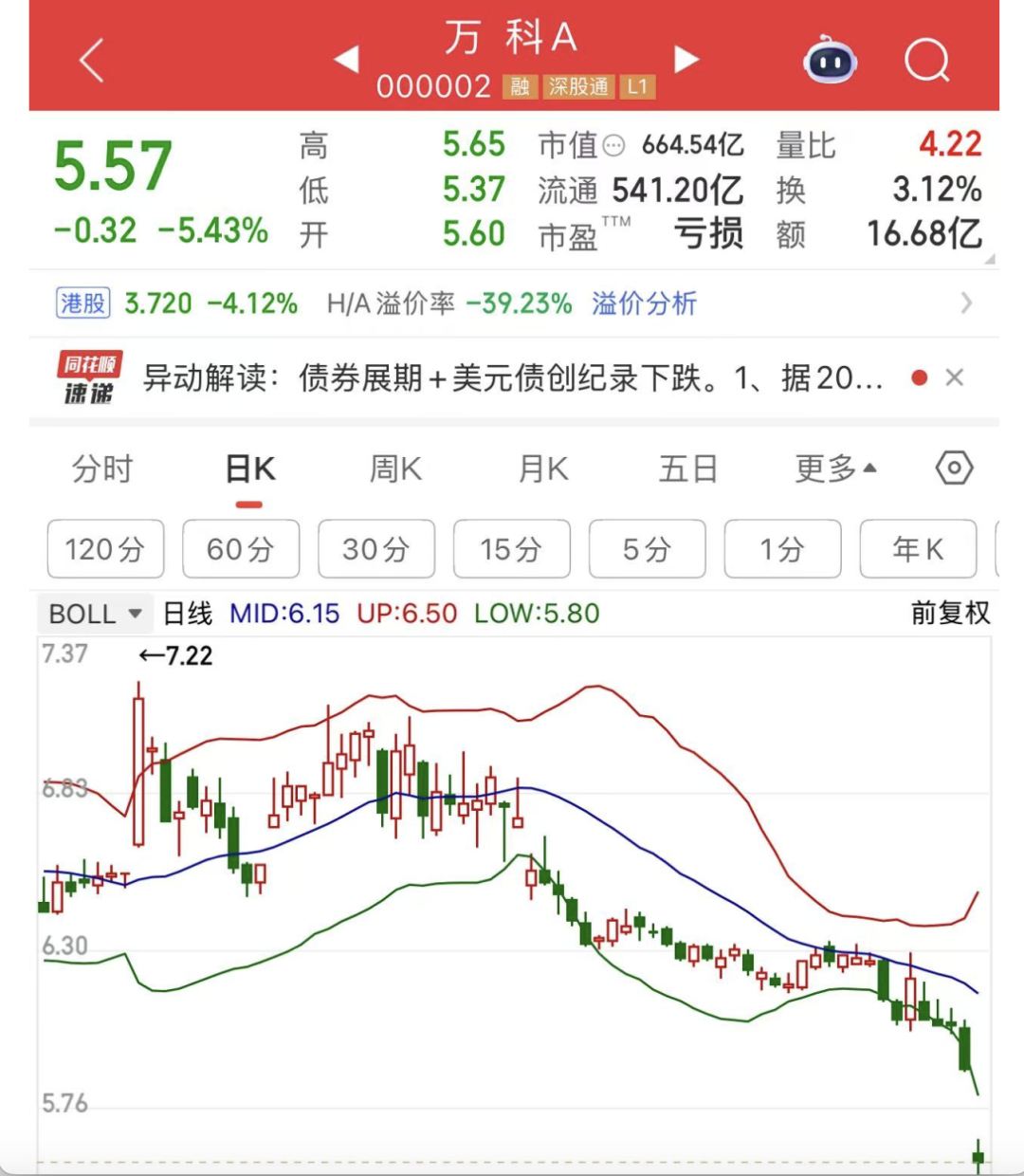 股价表现同样不容乐观。截至今日上午收盘,万科A(000002.SZ)一度下探至5.37元/股,跌超7%,续创2016年以来新低。万科企业(02202.HK)跌超5%,一度下探至3.55港元/股附近,创2014年以来新低。