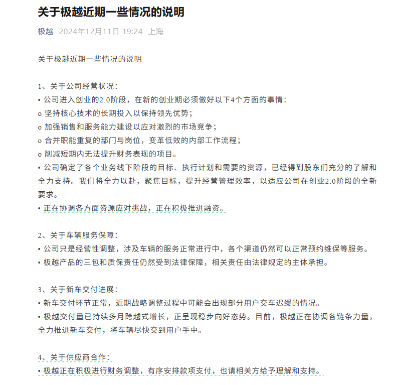 2024年12月,极越汽车“闪崩”,经营危机引发关注。2024年12月11日,极越汽车发文称,公司进入创业的2.0阶段。此后,网上陆续流传出极越多部门原地解散、极越门店关闭、车主权益落空等消息。