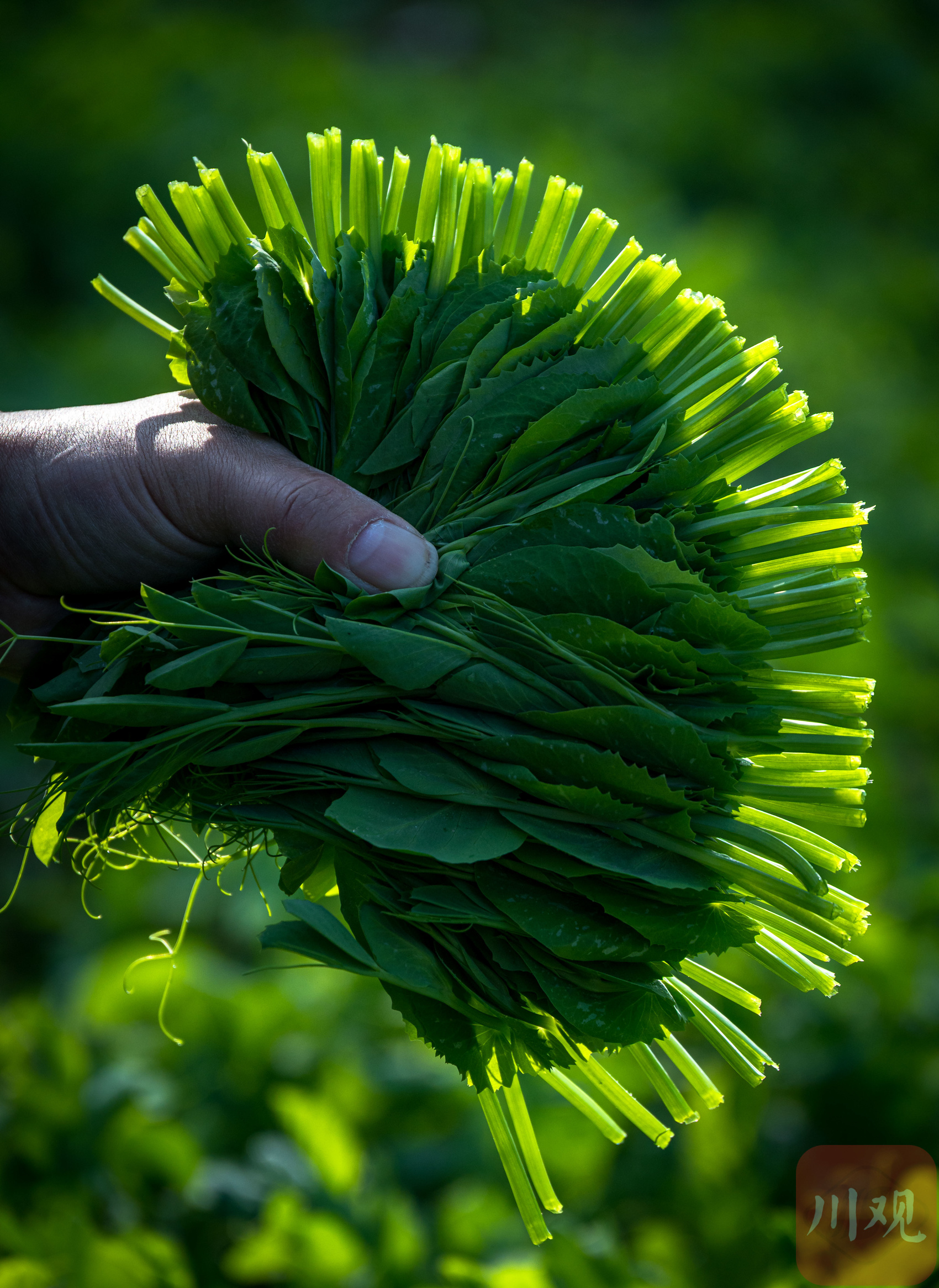 村民采摘下的豌豆尖捏在手上像一朵盛开的“鸡冠花”。