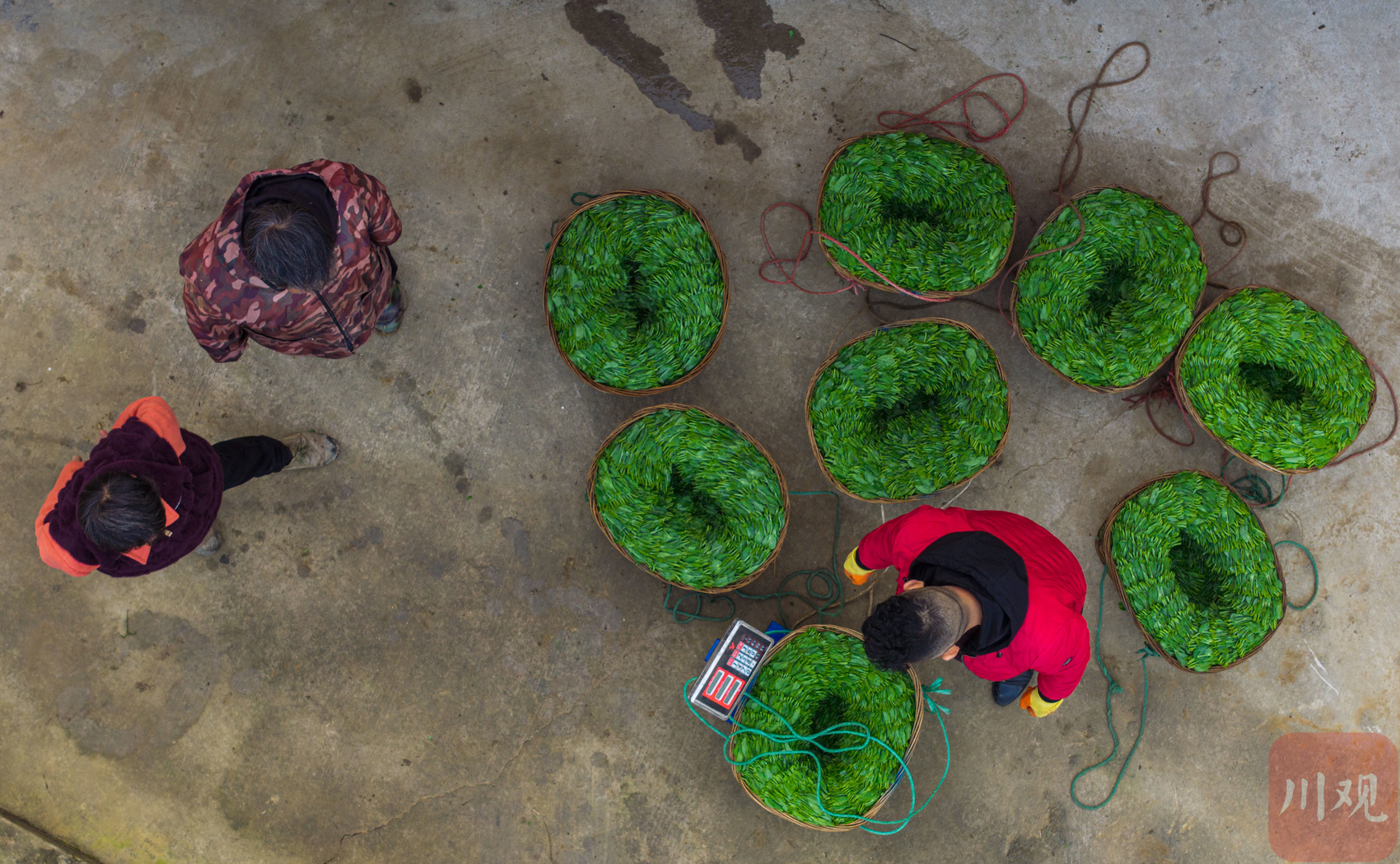村民按“螺纹”顺序摆放豌豆尖。