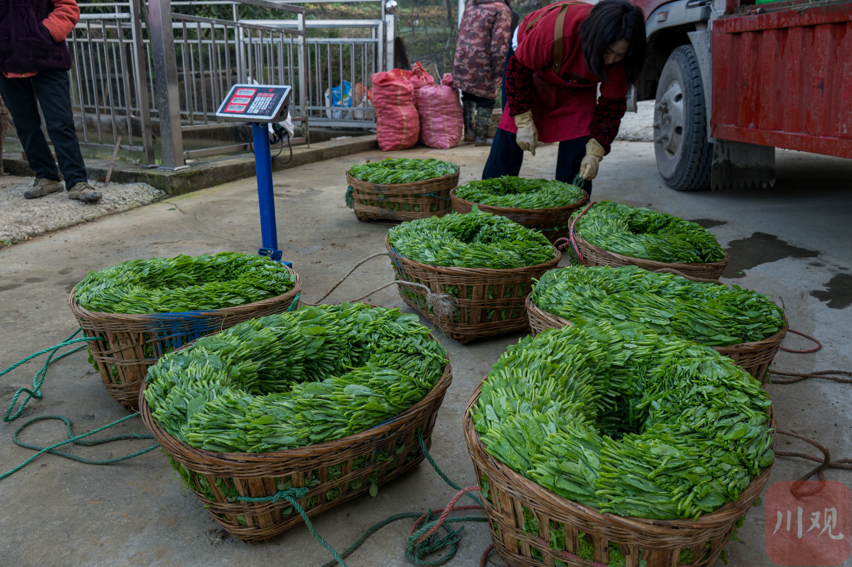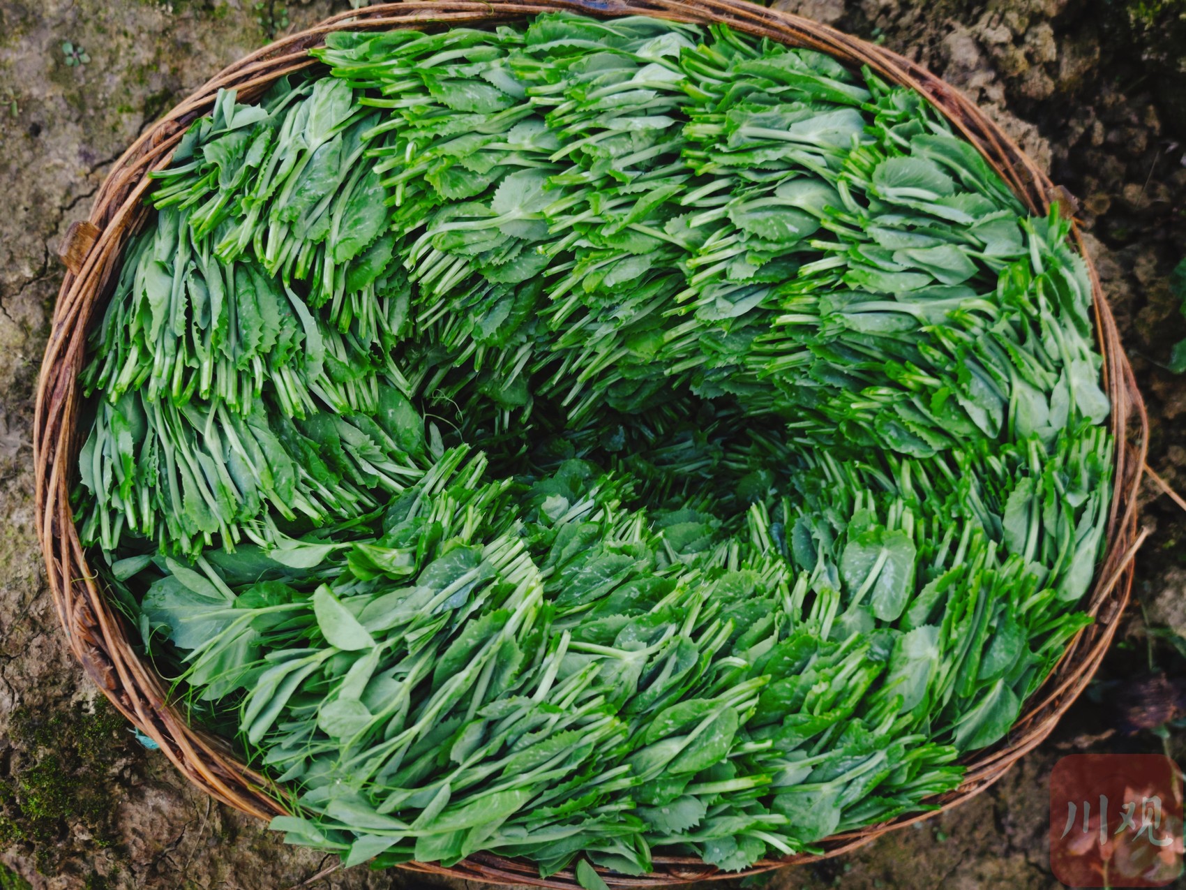 “螺纹”状叠放的豌豆尖摆放在竹筐中。