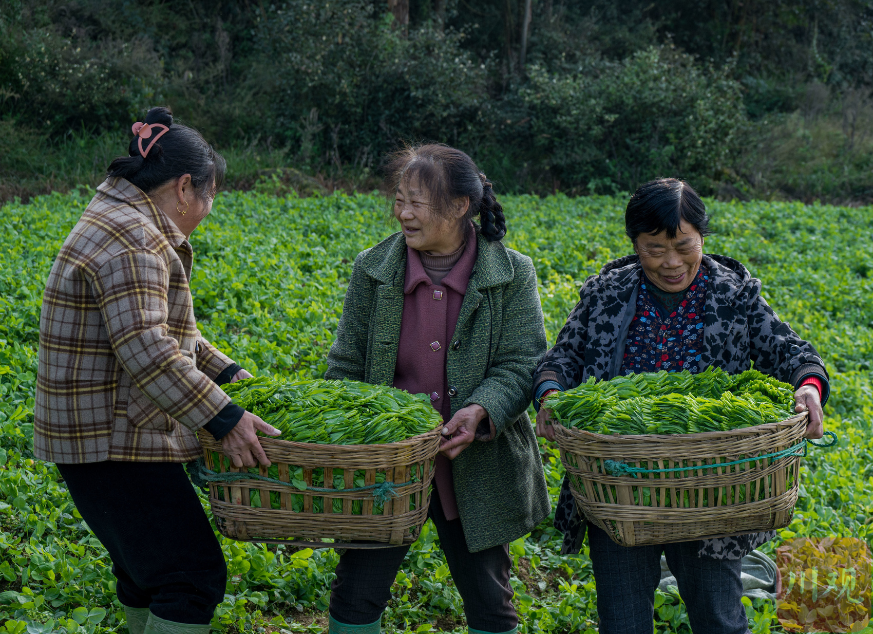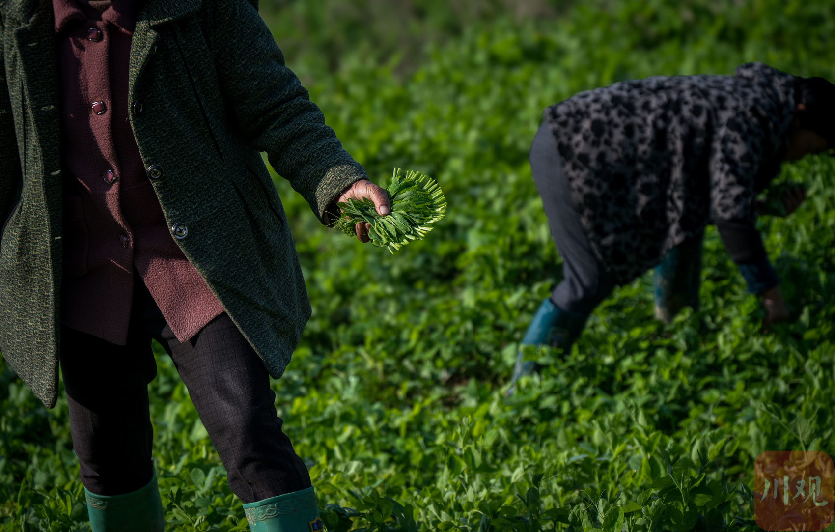 指尖在藤蔓间轻捻慢放,嫩得仿佛能掐出水的豌豆尖便成把落入筐中——不到一个小时,竹筐里已堆出一圈圈鲜绿的螺纹,叶尖上的水珠顺着弧度向下滑落,成了田埂边最灵动的“装置艺术”。