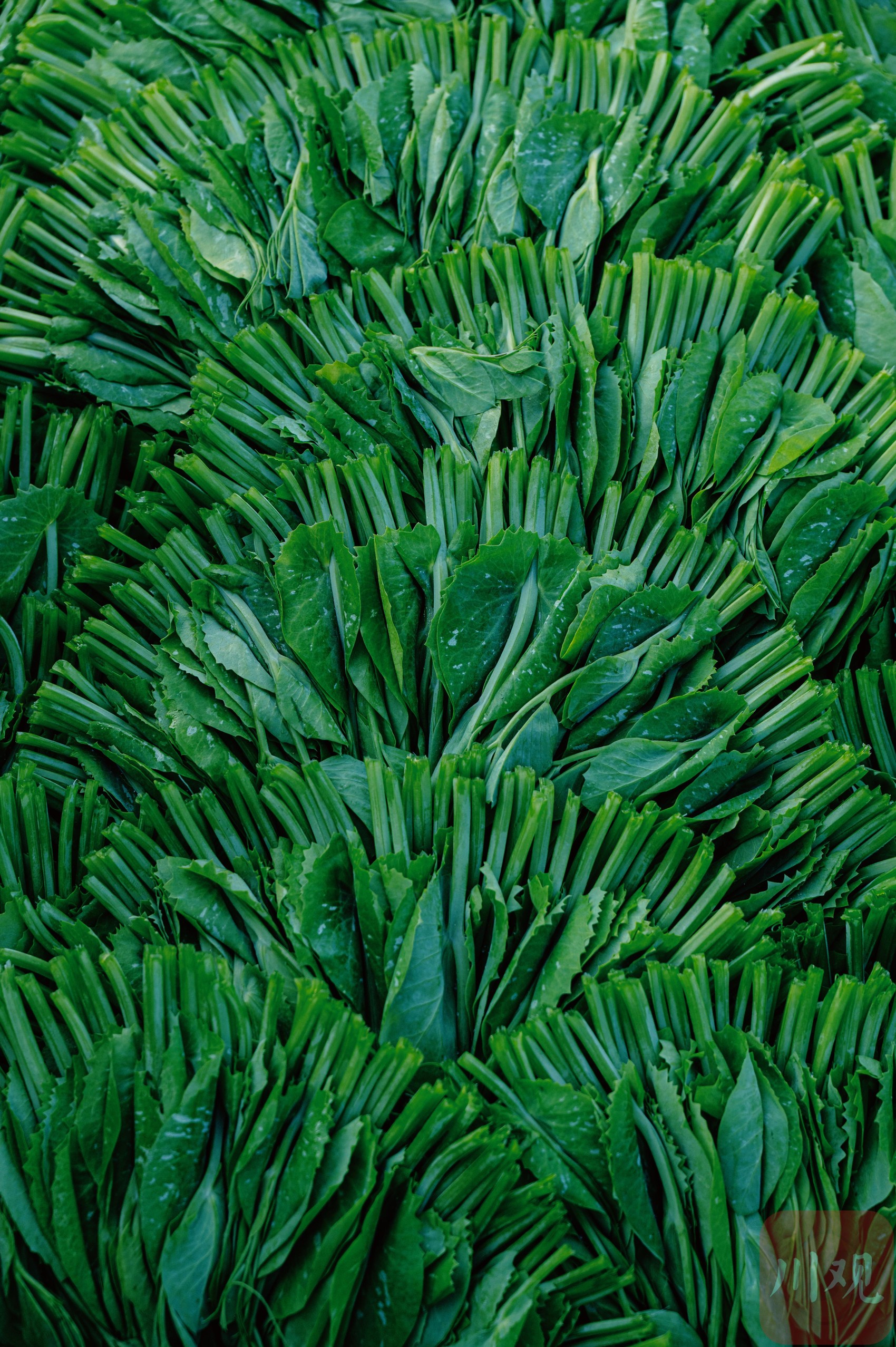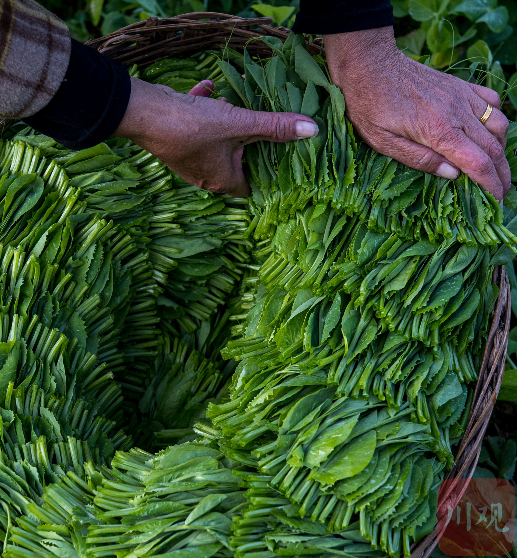 接着,她开始完成这件“装置作品”:左手托起攒好的豌豆尖,右手轻轻捋顺,让所有叶尖朝向一致,再贴着竹筐内壁从外往内层层叠放:第一圈沿筐边铺得松散,第二圈微微向上叠半寸,每码三层便用手指轻按一下。鲜绿的茎秆顺着筐形自然盘绕,渐渐旋出细密而有序的“螺纹”。遇到带着露珠的嫩梢,她会特意将叶背朝上,让水珠沿叶面滑入筐底,恰好滋润下层的茎秆,既锁住豌豆尖的清甜,也保持其鲜嫩质地。