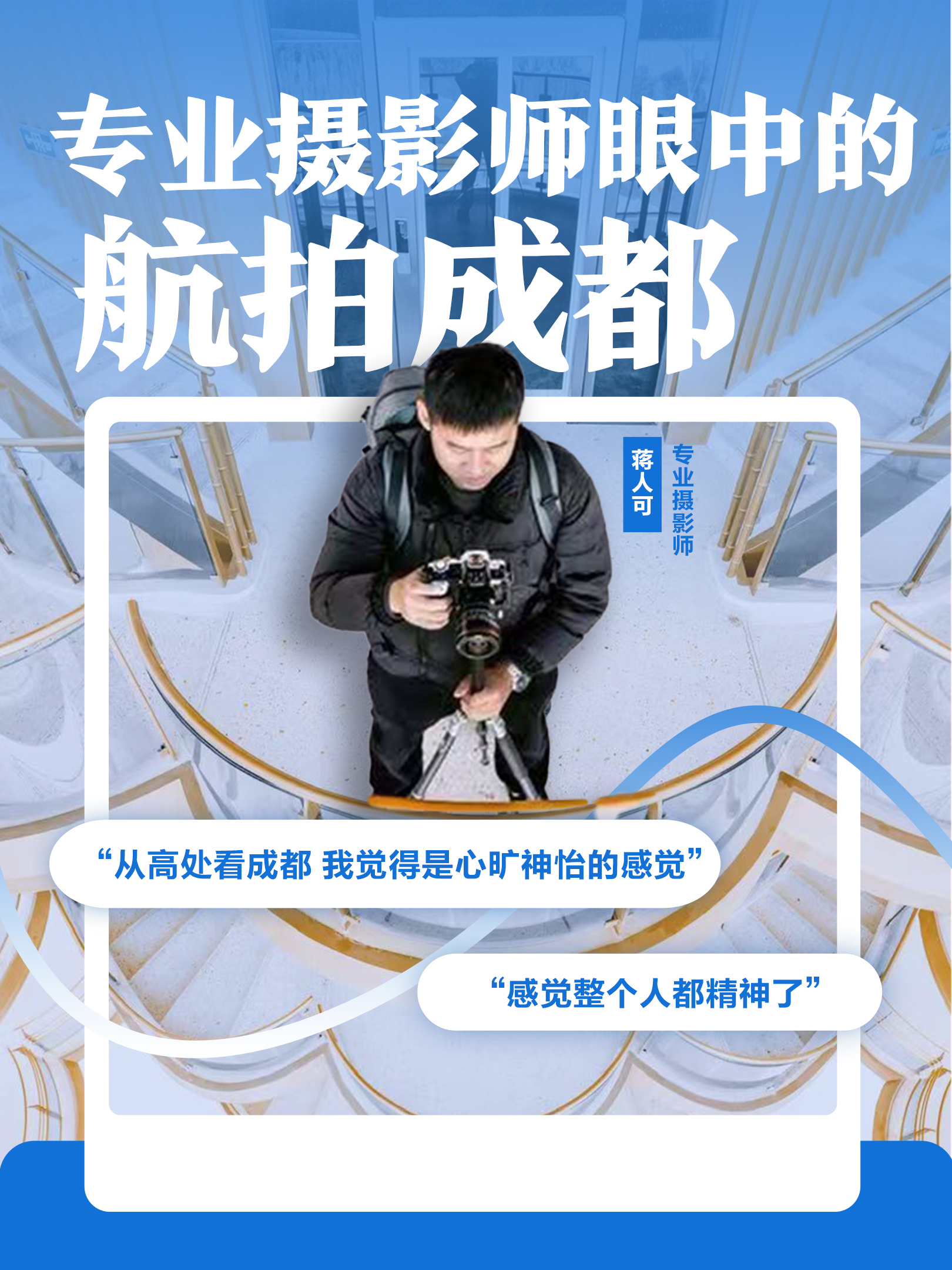 如今,蒋人可已是成都高空摄影领域代表之一,作品获国内外大奖,但他未停下脚步。他希望通过作品让更多人了解、爱上成都,还期待与同行合作推动摄影事业发展,用影像记录成都更美好的未来。他将继续在高空用镜头书写成都故事,让城市之美绽放世界。