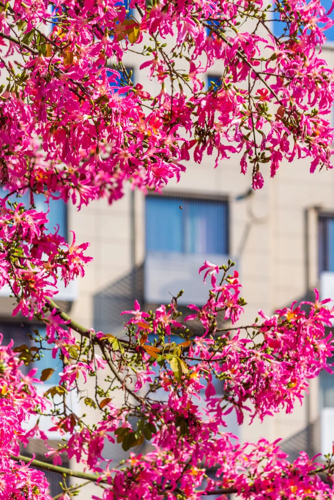 密密匝匝的花簇撑开如伞,与澄澈如洗的蓝天相映,随手定格便是自带柔光的胶片感大片。若想沉浸式感受这份美好,不妨搭乘粉色 “萌萌巴” 环线公交,车窗外粉浪翻涌,城市在花影中流动,每一段路程都成了与浪漫的不期而遇。