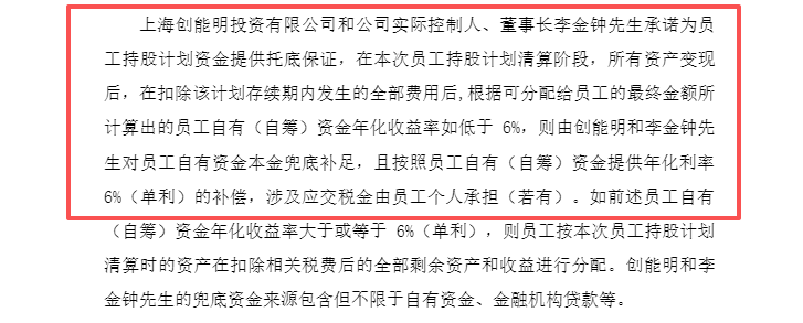 同时,根据公告,为强化对核心员工的长期激励效果,实现公司与员工的利益共享,创能明和李金钟承诺为员工持股计划资金提供托底保证。在员工持股计划清算阶段,所有股票变现后,在扣除该计划存续期内发生的费用后,根据可分配给员工的最终金额所计算出的员工自有(自筹)资金年化收益率如低于6%,则由创能明和李金钟对员工自有资金本金兜底补足。
