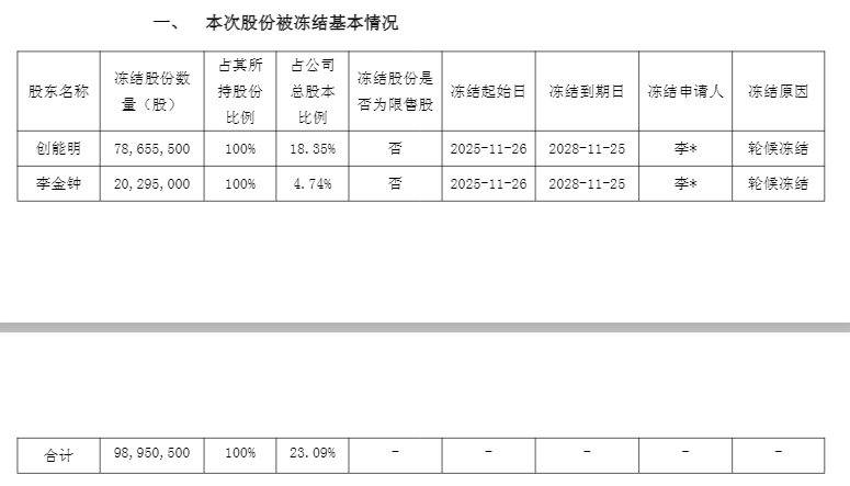 公告显示,公司控股股东上海创能明投资有限公司(以下简称“创能明”)、实际控制人李金钟所持有的全部公司股份被轮候冻结。其中创能明持有公司股份7865.55万股、实际控制人李金钟持有公司股份2029.50万股,分别占公司总股本的18.35%、4.74%。