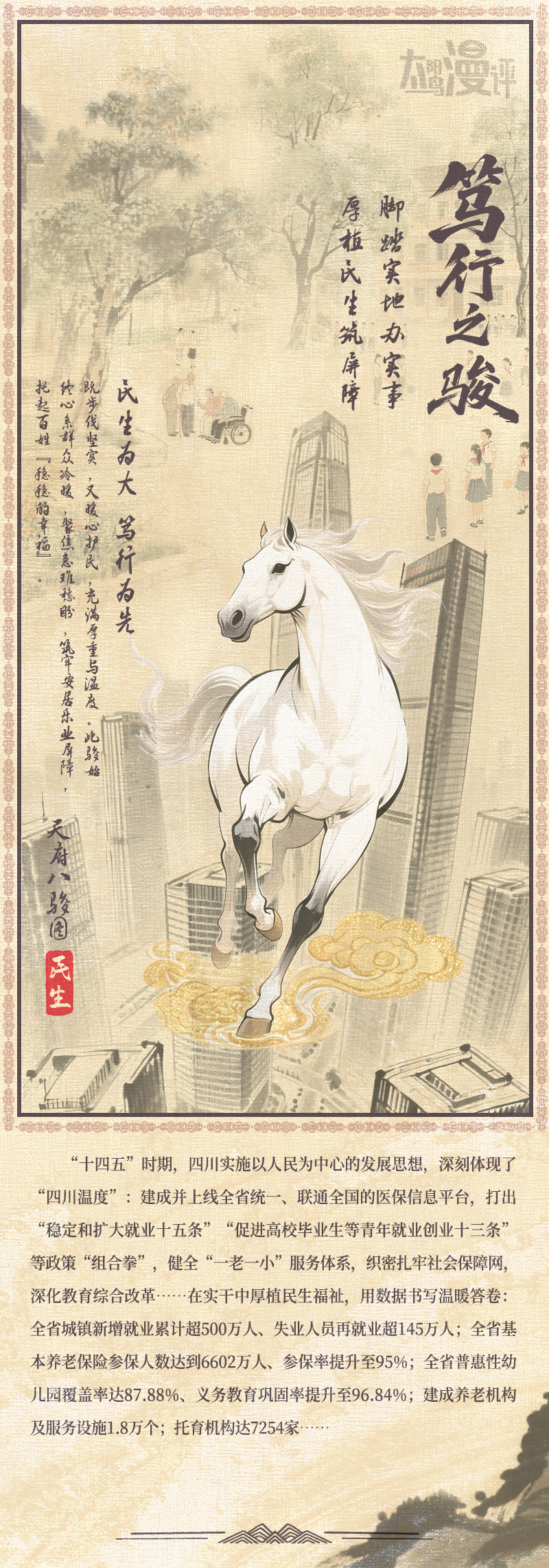 “十四五”时期,四川实施以人民为中心的发展思想,深刻体现了“四川温度”:建成并上线全省统一、联通全国的医保信息平台,打出“稳定和扩大就业十五条”“促进高校毕业生等青年就业创业十三条”等政策“组合拳”,健全“一老一小”服务体系,织密扎牢社会保障网,深化教育综合改革……在实干中厚植民生福祉,用数据书写温暖答卷:全省城镇新增就业累计超500万人、失业人员再就业超145万人;全省基本养老保险参保人数达到6602万人、参保率提升至95%;全省普惠性幼儿园覆盖率达87.88%、义务教育巩固率提升至96.84%;建成养老机构及服务设施1.8万个;托育机构达7254家……