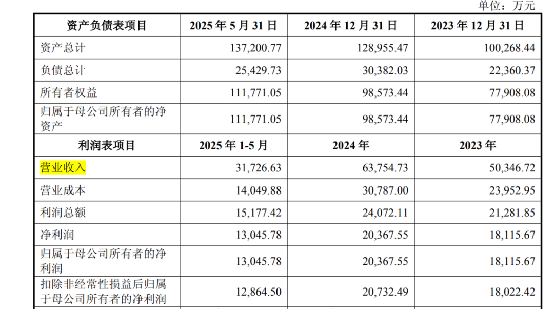 财务方面,2023年、2024年、2025年前5月的营收分别为5.03亿元、6.38亿元、3.17亿元,净利润分别为1.81亿元、2.04亿元、1.30亿元。截至2025年5月31日,茵地乐资产总计13.72亿元,负债总计2.54亿元,归属于母公司所有者的净资产为11.18亿元。