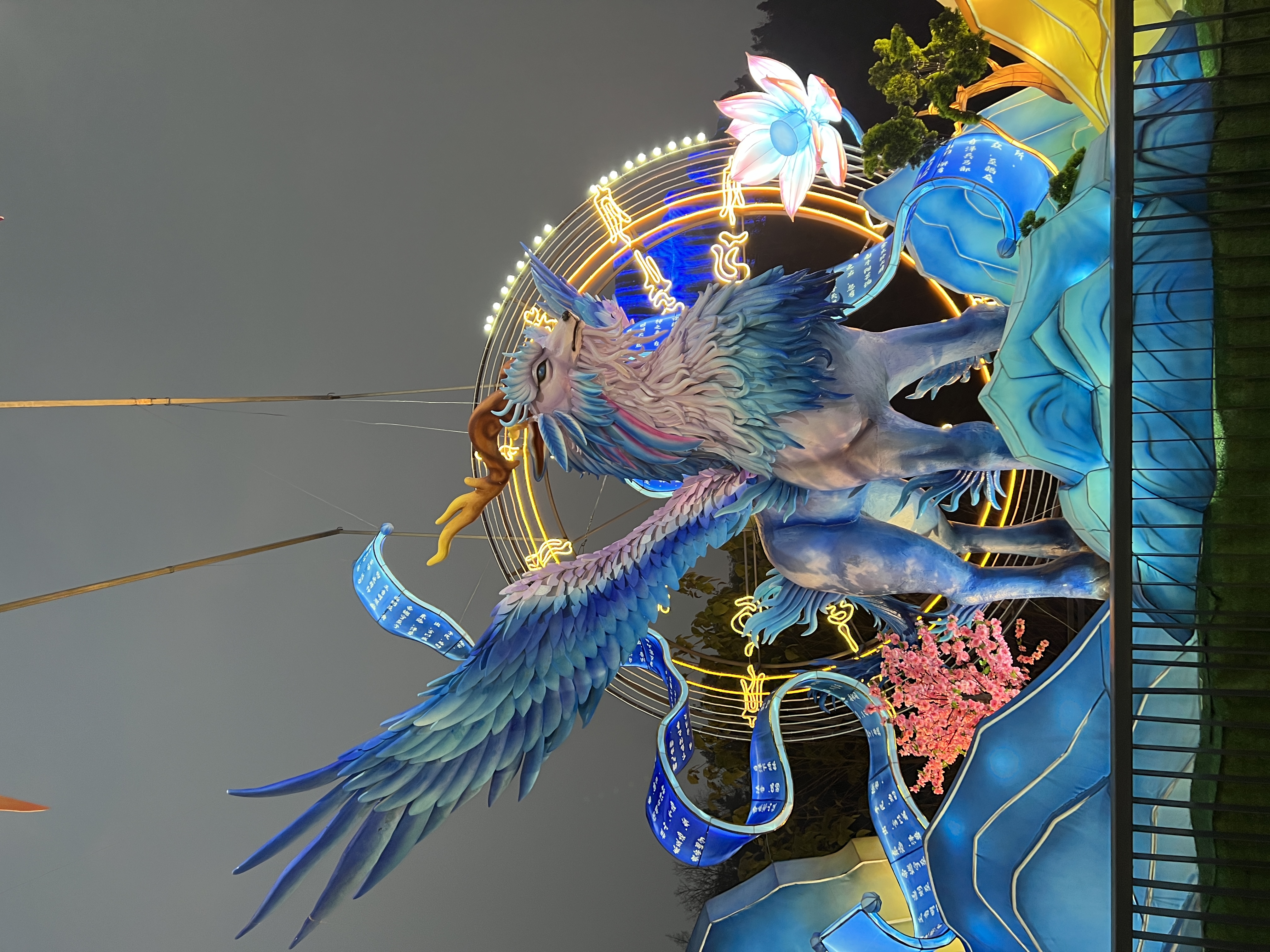 最终,200多斤稻草在彩灯工匠的巧手下,变成了一只雄赳赳气昂昂的金毛吼,一堆10立方的泡沫变成了一只插着翅膀昂首欲飞的白泽,6000多根扭扭棒被扭成了一只金光闪闪的貔貅。