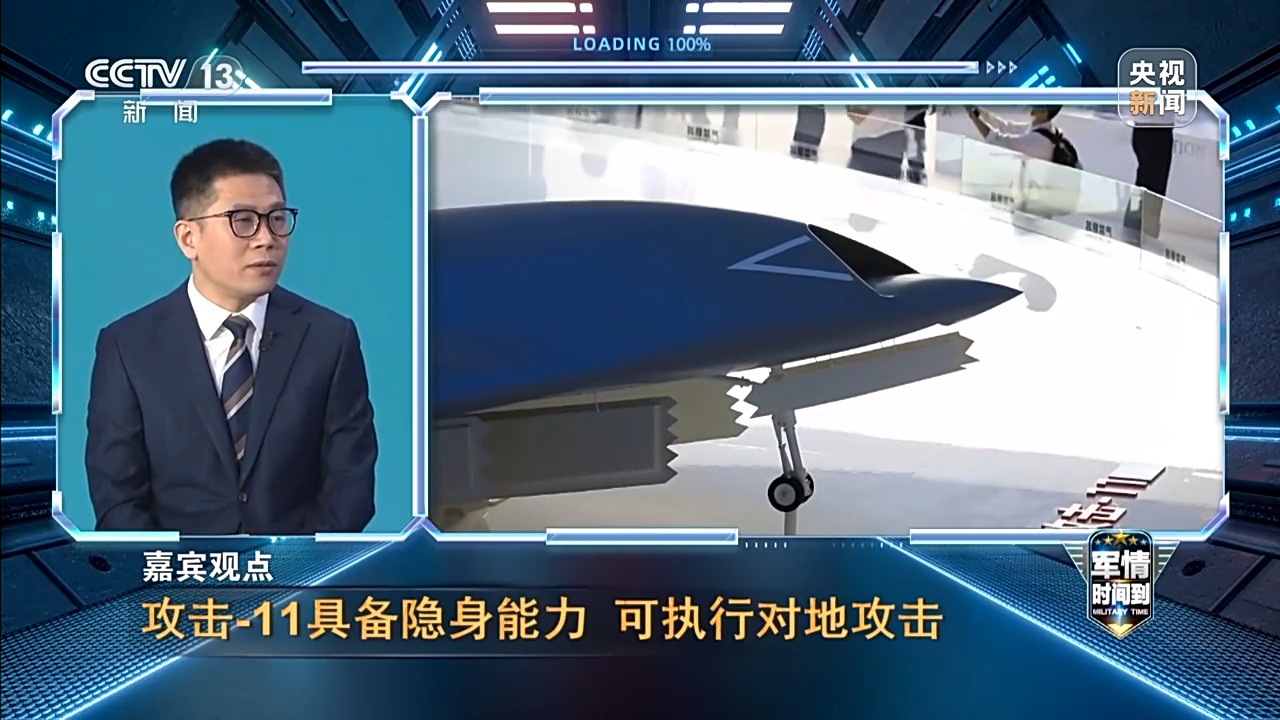 军事评论员张学峰:首先这里面有两种隐身战机,另外一种歼-16D也是可以有效地配合这两种隐身战机,为这两种隐身战机赋能。像其中的攻击-11从编号来看,就可以知道它是用来对地面目标进行打击的。而且它使用的飞翼布局方式具有高隐身的特性,而且是全向隐身,它的雷达反射截面积甚至要比歼-20还小。未来作战中它主要是用来对对方的地面、海上目标进行打击。