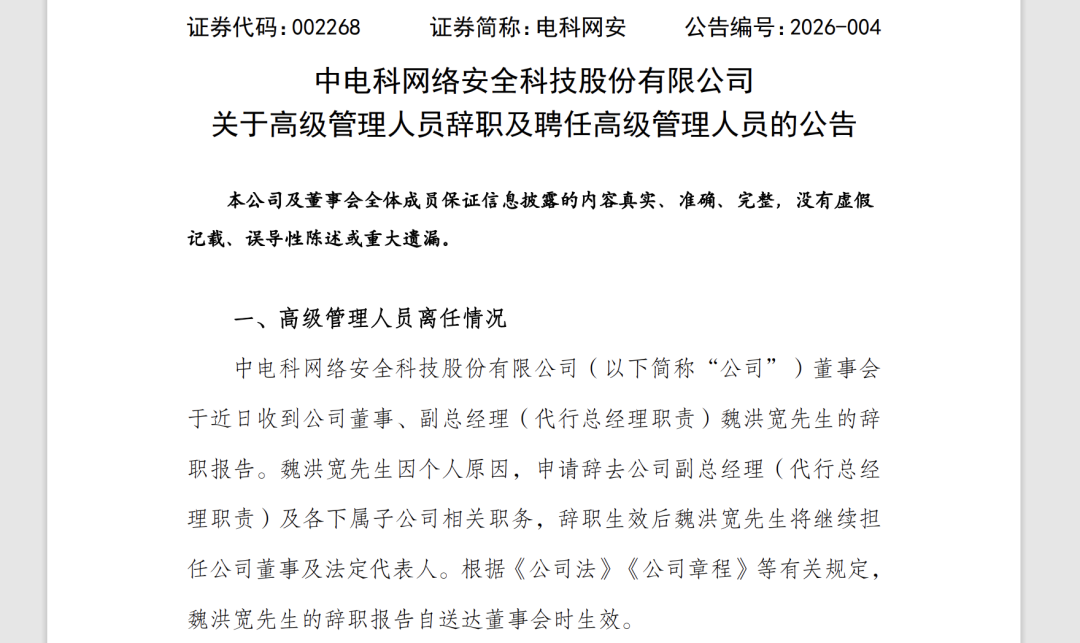 微成都报道 1月26日,电科网安(002268.SZ)发布公告称,魏洪宽因个人原因,申请辞去公司副总经理(代行总经理职责)及各下属子公司相关职务,辞职生效后魏洪宽将继续担任公司董事及法定代表人。
