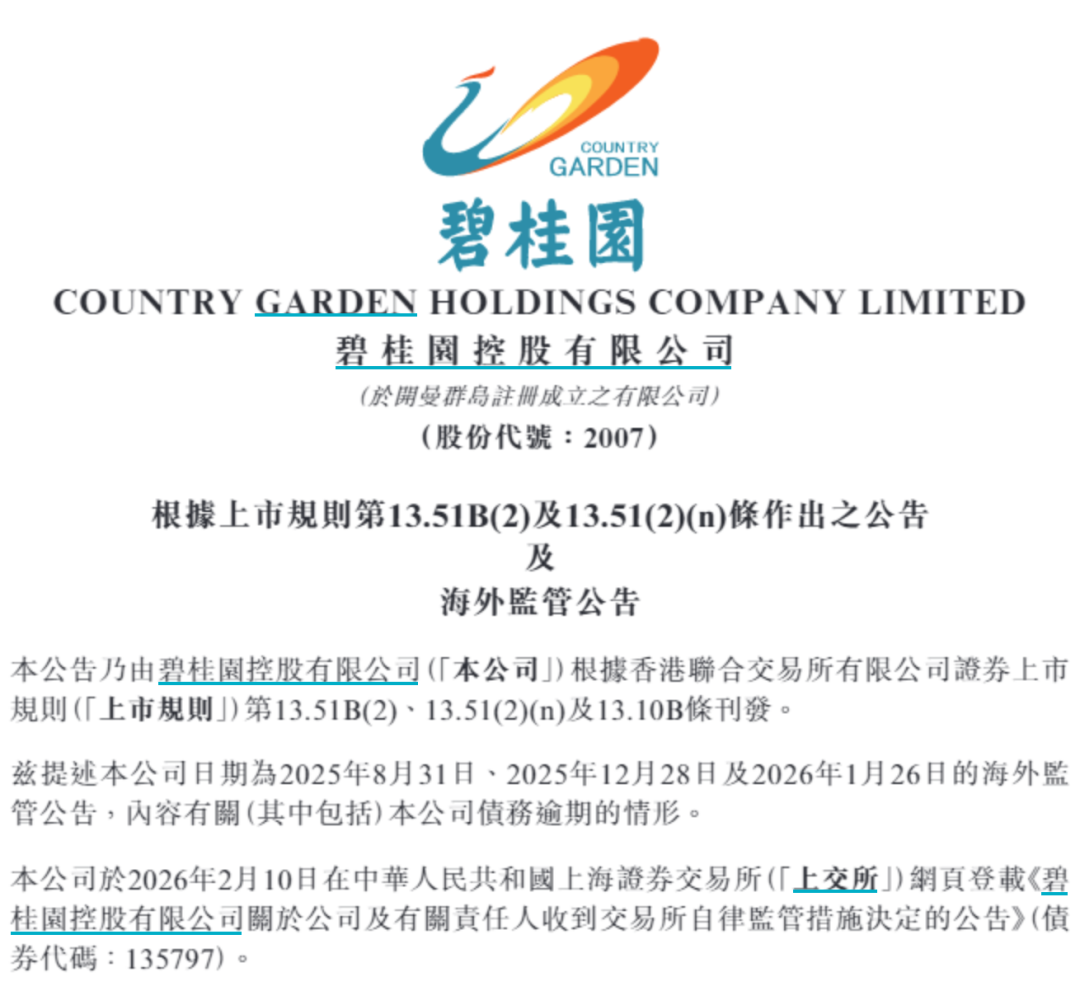 2月10日,碧桂园在港交所公告称,本公司及本公司执行董事及主席杨惠妍、执行董事及联席主席莫斌及执行董事及财务负责人伍碧君于近期收到上交所出具的《纪律处分决定书》,由于公司未能按照上交所的相关债券上市规则等规定及时披露公司于2023年8月至12月、2024年1月至6月、2024年7月至12月存在债务逾期情形,上交所分别对公司、杨惠妍、莫斌、伍碧君及其他具名人士作出自律监管措施决定,对公司及上述人员予以通报批评,并记入诚信档案。