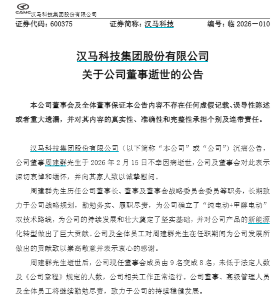 公告显示,周建群曾任公司董事长、董事及董事会战略委员会委员等职务,为公司确立了“纯电动+甲醇电动”双技术路线,对公司产品的新能源化转型做出了巨大贡献。周建群逝世后,公司董事会成员由9名变为8名,未低于法定人数及《公司章程》规定的人数,公司相关工作正常运行。