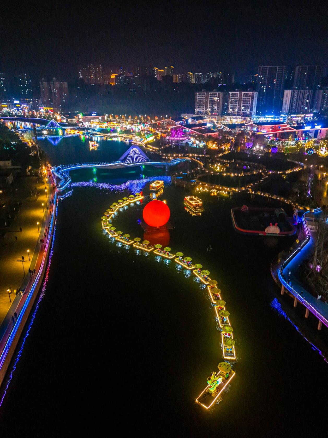 夜晚,广安賨城里上新的“西溪一条龙”联排竹筏项目惊艳亮相。多艘单体竹筏首尾相接,宛如一条光影巨龙缓缓离岸,航线往返约2公里,既能体验夜间光影,又可欣赏沿岸精彩表演,搭配打铁花等特色表演,年味更足。