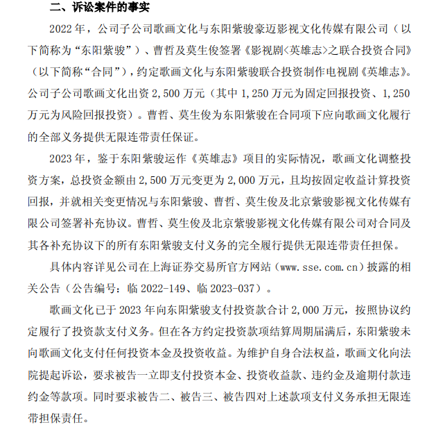 2023年,鉴于东阳紫骏运作《英雄志》项目的实际情况,歌画文化调整投资方案,总投资金额由2500万元变更为2000万元,且均按固定收益计算投资回报,并就相关变更情况与东阳紫骏、曹哲、莫生俊及紫骏影视签署补充协议。曹哲、莫生俊及紫骏影视对合同及其各补充协议下的所有东阳紫骏支付义务的完全履行提供无限连带责任担保。