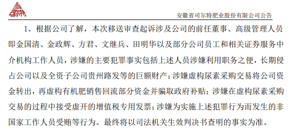 据此前公告,2023年底,司尔特在自查过程中发现了部分管理人员涉嫌利用职务之便侵占公司全资子公司贵州路发巨额财产,经多次约谈相关人员,其拒不配合公司自查并相继辞职。