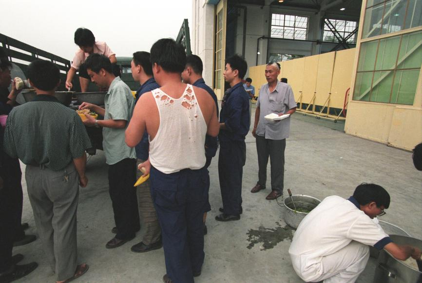那是1997年的一个夏日,试飞站闷热如蒸笼。为了抢进度,众人连续加班,饭食都是直接送到现场。刚端起饭盒,李勇就瞥见一个背影。现场一位穿着背心的同志正在排队打饭,破洞的背心浸满汗液。他瞬间提起了精神,握住相机。为了强国的使命,公司党委义无反顾,“勒紧裤腰带”也要干歼-10,我们的职工又何尝不是憋着一口气,在艰苦的条件下奋勇前行。没有过多思考,李勇迅速找准位置,举起相机,对准、调焦一气呵成,将这一画面永恒定格。