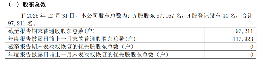 公司披露,拟向全体股东(包括A股股东和H股股东)每股分配现金股利1.20元(含税),共派发股利31.32亿元。截至2025年12月31日,公司股东总数为:A股股东97167名,H股登记股东44名,合计97211名。