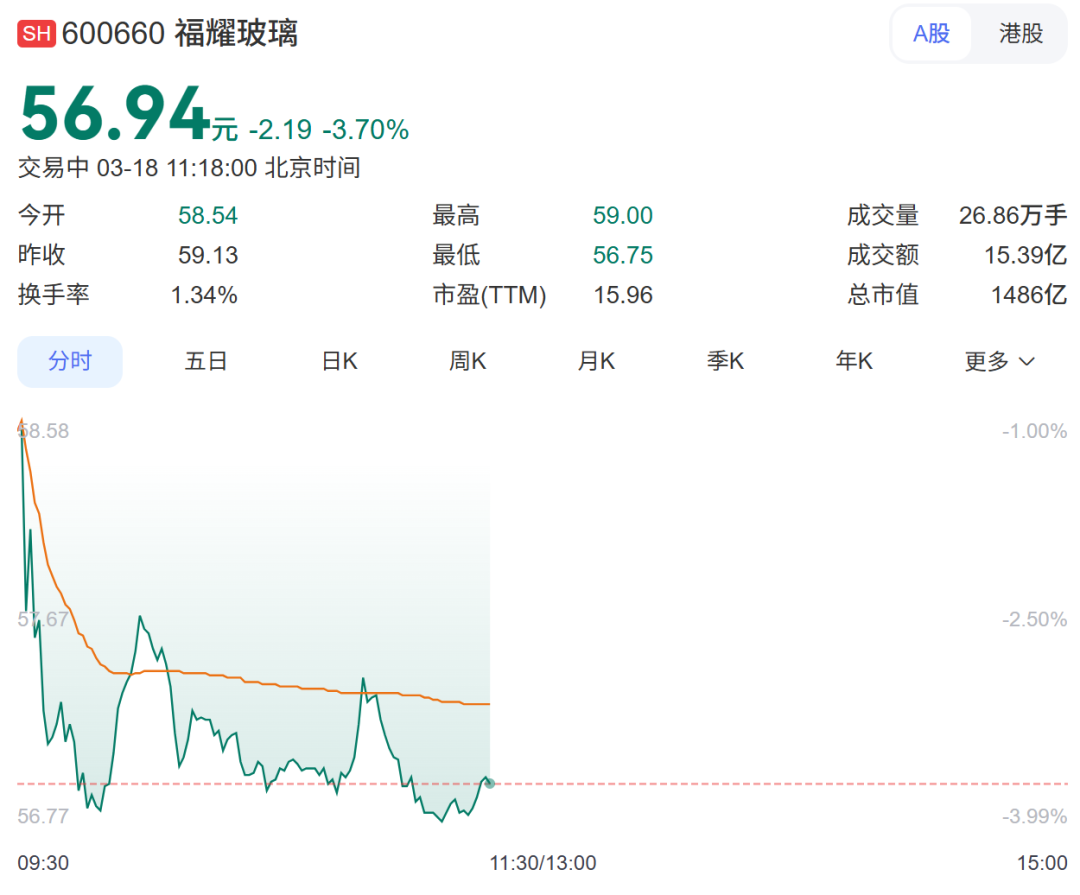 3月18日,福耀玻璃A股股价下跌,截至发稿跌3.7%,报56.94元,港股跌2.96%,报60.75元。