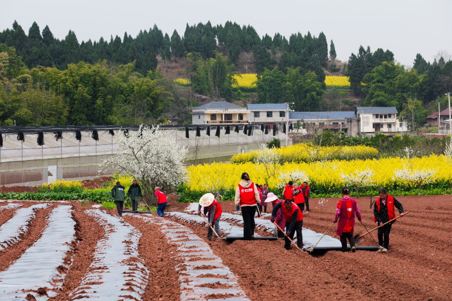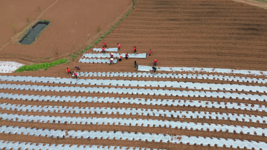 与此同时,园区露天种植区域一派繁忙景象。村民们在技术员指导下,为开沟起垄后的土地覆盖银灰膜,全力做好大规模栽种准备。