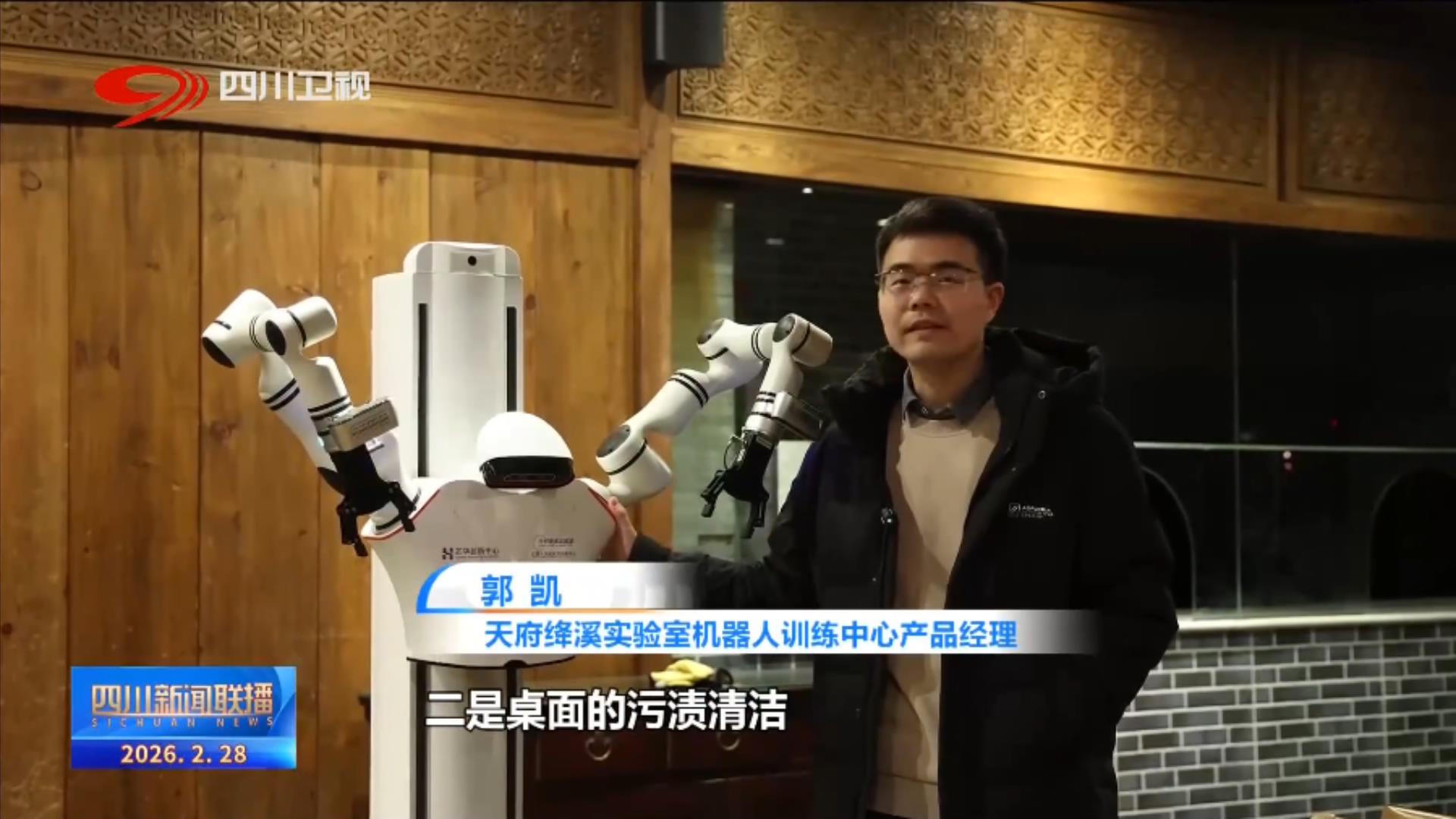 天府绛溪实验室机器人训练中心产品经理 郭凯:当前它具备两项技能,一是桌面的垃圾清理,二是桌面的污渍清洁。这款机器人不是通过遥操的方式,只要一个口令,它就可以自主地找到抹布,然后找到垃圾,自主地规划路线,做规定的动作。